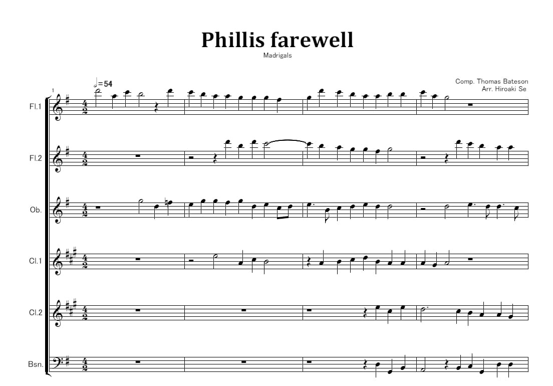 「Phillis farewell」は、イングランドの作曲家 トーマス・ベイトソン (Thomas Bateson) が作曲したマドリガルです。彼の最初のマドリガル集である「The First Set of English Madrigales to 3, 4, 5 and 6 Voices」に1604年に収録されています。