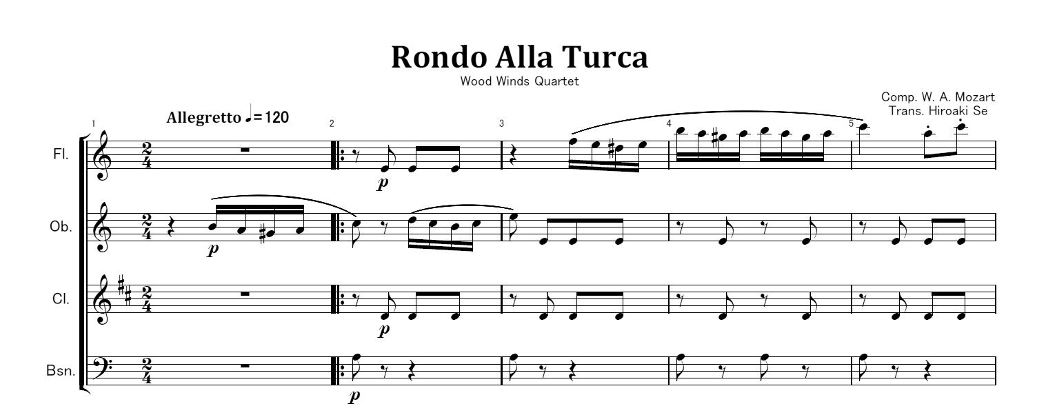 トルコ行進曲木管四重奏楽譜(モーツァルト/編曲 瀬 浩明)
