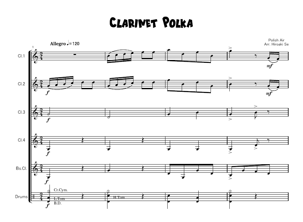 編成はクラリネット4本、バスクラリネットに加えてドラムセット(省略可)です。