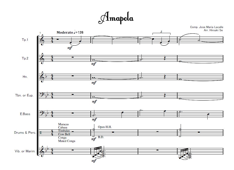 編成はTp.2本、Hn.、Tbn.またはEup.、マリンバまたはヴィブラフォン、エレキベースに加えて