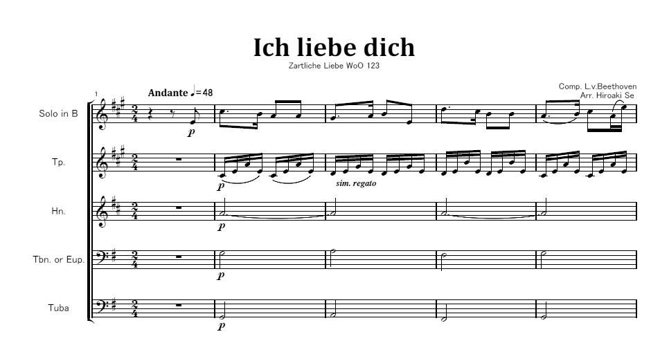 編成はTp.、Hn.、Tbn.またはEup.、TubaおよびSoloパートです。