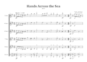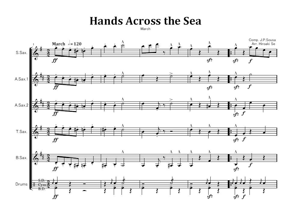 続く第1マーチはニ短調のトニックで開始し、すぐにヘ長調へ移行します。この調の配置が、『海を越える握手』の、一聴して不思議な雰囲気に影響しています。