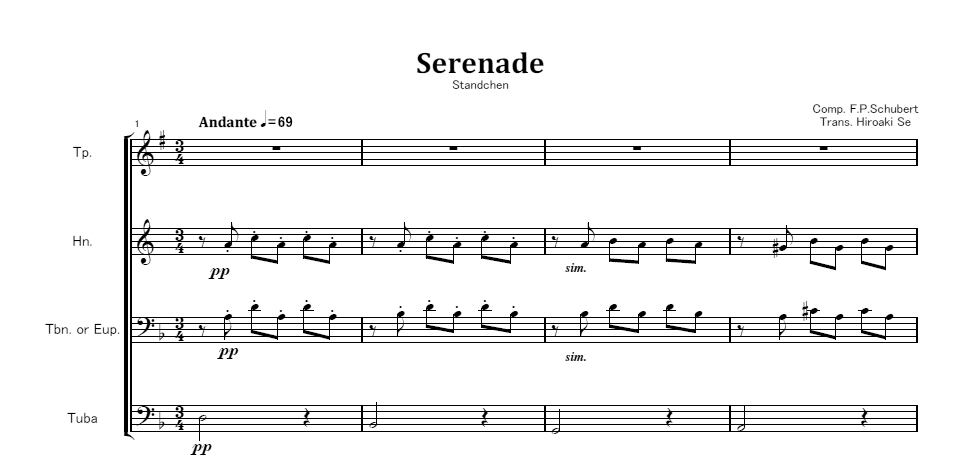編成はTp.、Hn.、Tbn.またはEup.、Tubaです。
