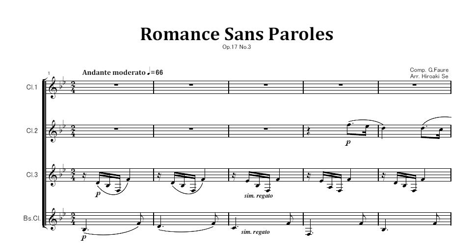 クラリネット四重奏 3つの無言歌 Op.17から第3番 Op.17-3