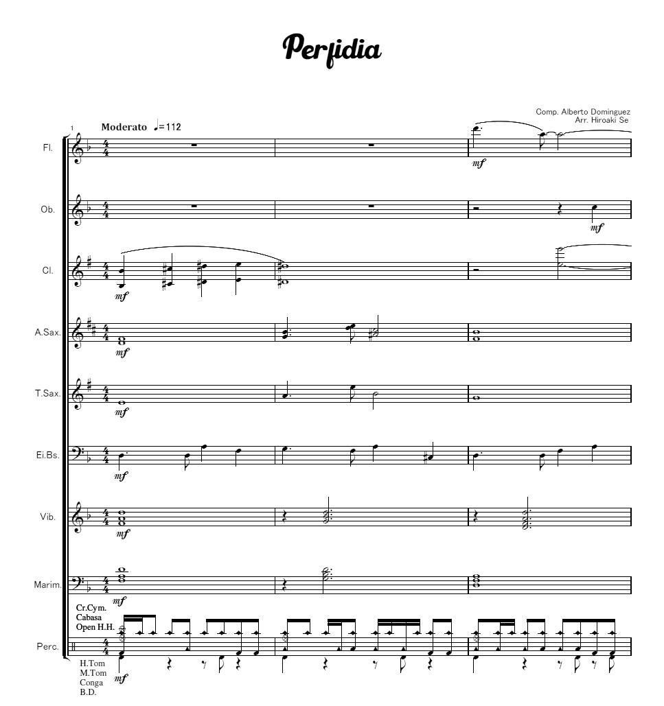 編成はFl.、Ob.、Cl.2本、A.Sax.2本、T.Sax.、El.Bs.、Drum Setに加えて