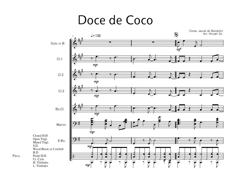 編成はソロ楽器、Cl.3本、Bs,Cl.、ドラムス、マリンバ、エレキベースに加えて