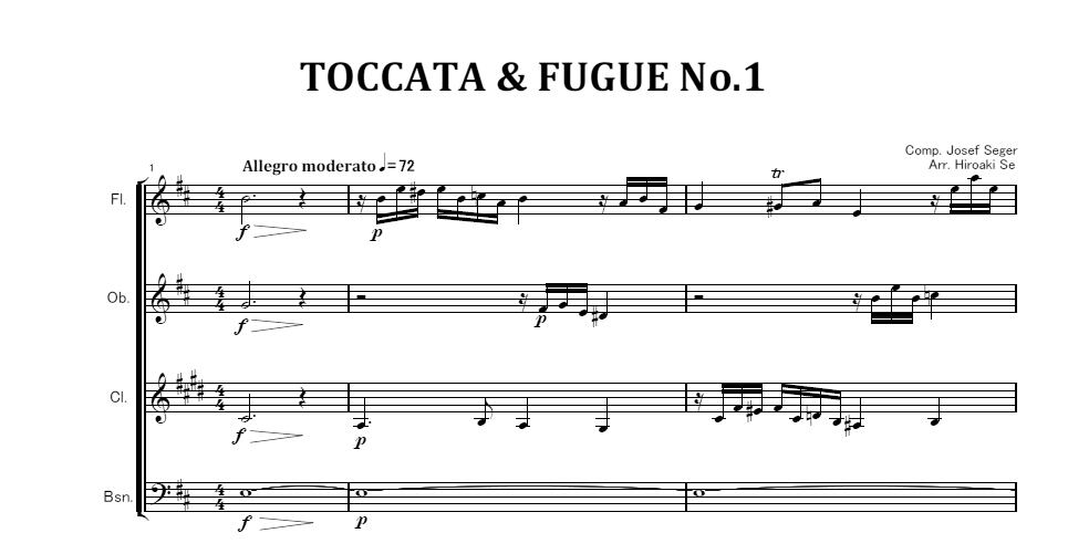 編成はFl.、Ob.、Cl.、Bsn.です。Fl.パートはOb.で演奏可能です。