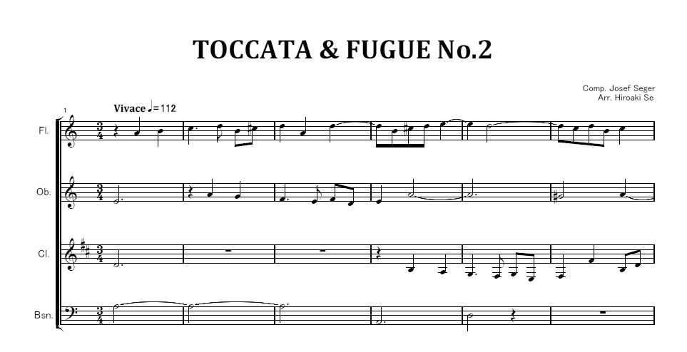 編成はFl.、Ob.、Cl.、Bsn.です。Fl.パートはOb.で演奏可能です。